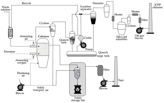 The flow diagram for the waste calcining facility (WCF), installed in early 1970s in Idaho Chemical Processing Plant (ICCP), is shown in Figure 5. The main element of the process is an about 1.2 m in diameter calcination vessel, in which radioactive aqueous waste is continuously sprayed, and a fluidized bed using pneumatically delivered air. Ignition is spontaneous at temperatures above 335 °C in the presence of nitrates. After the start-up, the wastes are calcined at temperatures in the range of 400–500 °C during routine operation. In the fluidized bed, water flows out, and metal salts are converted into oxides or fluorides and settled as growing layers on spherical grains of the bed. These solid grains are continuously removed from the calcination container to maintain a constant height of the bed and then pneumatically transported to the steel storage tanks, stored near the calcination plant [20,21].
