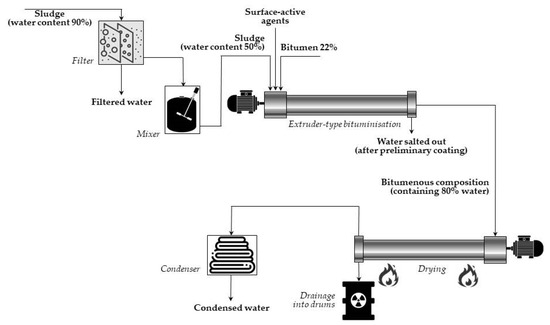 | Bituminization | Treatment of waste with or converting it into bitumen to prevent leaching the hazardous components of waste by environmental waters. | Batch processes usually involve drying the waste and then mixing the dried material into molten bitumen. In this process, waste is continuously introduced into a metered volume of molten bitumen at about 200–230 °C. In the extrusion continuous systems, temperature of bitumen is kept at 130–200 °C [2]. |