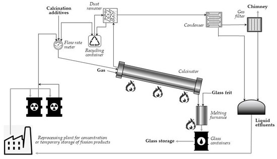 The oldest method of calcination is a pot process. The pot-calcination process consists of simply feeding the radioactive waste in the evaporator for concentration and for withdrowing the volatile components (e.g., nitric acid resulting from the reprocessing of nuclear fuel) are withdrawn by steam. Then, the concentrate is fed into a calcination vessel for thermal decomposition of dissolved solids, usually at temperatures below 900 °C, converted into a solid cake, and, finally, calcined. After finishing calcination, the container with the solidified content is withdrawn from the system, closed, and sent for storage (temporary or final).