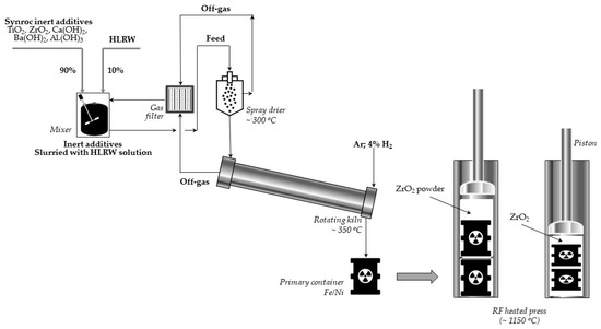 - Regan, W.H.; Hatch, L.P.; Domish, R.F. Continuous Calcination of High-Level Radioactive Wastes by a Rotary Ball Kiln. In Proceedings of the Symposium on Treatment and Storage of High-Level Radioactive Wastes Radioactive Wastes, Vienna, Austria, 8–12 October 1962; IAEA: Vienna, Austria, 1963; pp. 179–194. [Google Scholar]