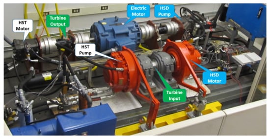The HST pressure is electronically controlled by the HST motor swash plate voltage. The system has two states and one actuator dynamics. The transfer function from voltage input, to the pressure, is a third-order system. To minimize the tracking error and reject disturbances, a PI controller is implemented to determine the swash plate voltage [9,24]. The control schematic is shown in Figure 3. The performance of the HST and controller is measured on the power regenerative dynamometer.