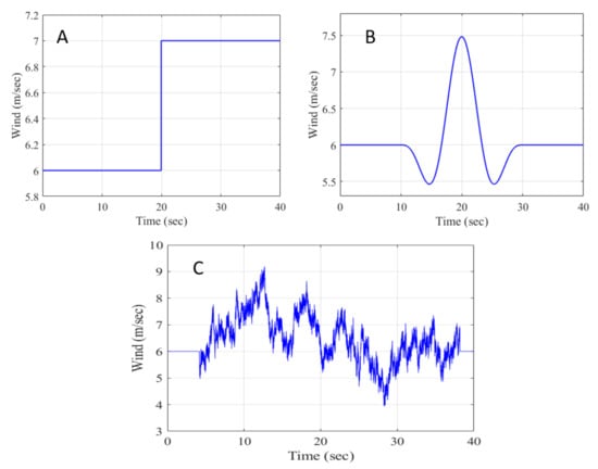 Wind inputs. (A) Step wind. (B) Guest wind. (C) Turbulent wind.