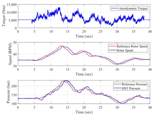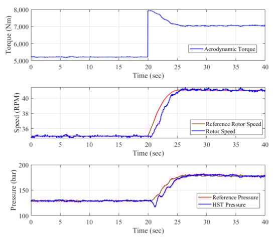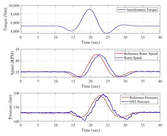 Gust Wind: The aerodynamic torque applied to the rotor during a wind gust is shown in the first plot of Figure 8. It can be seen that the torque and rotor speed follow the same trend as the wind profile. The corresponding reference rotor speed and the rotor speed of the dynamometer are illustrated in the second plot. Due to the large inertia, the reference speed has a delay from the torque input. The measured HST pressure along with their reference signals are shown in the third plot. Both of the measured signals effectively track their reference counterparts, with a delay.