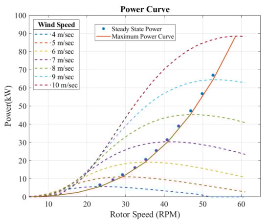 For steady-state performance, the wind speed is increased from 4 m/s to 9 m/s in steps of 0.5 m/s. The rotor power is computed from the input torque and the rotor speed. The simulated power as a function of the wind and rotor speed and the maximum power curve is shown in Figure 11. The steady-state power measurements are also plotted.