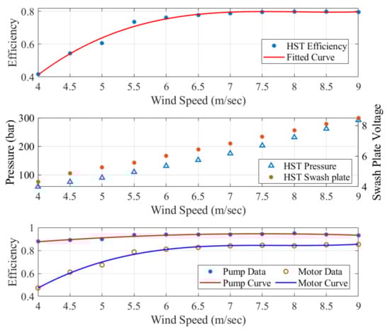 The HST power is a product of the HST motor torque, , and speed, , whereas the rotor power, is a product of applied rotor torque, , and speed, . The efficiency as a function of the wind speed is shown in the top plot of Figure 12. The HST pressure and the motor swash plate voltage are plotted in the middle plot.
