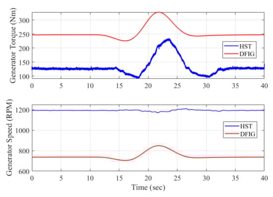 From Figure 13, the torque on the generator shaft is lower in the HST turbine than in the gearbox turbine, but the generator speed is higher in the HST turbine. When the input wind speed is less than rated, in the case of a gearbox turbine, the generator speed is less than the synchronous speed. As the generator speed in the gearbox turbine fluctuates in the face of a wind gust, power electronics are required to match the grid frequency. In the HST drive train, the generator speed remains nearly constant at synchronous speed despite the wind gust. The HST decouples the generator speed from the rotor speed allowing the generator to rotate at synchronous speed.