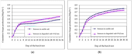 Cumulative biogas production for (a) the cocksfoot biomass obtained in arable soil and degraded soil supplemented with a 1% Z-ion addition and (b) the maize biomass obtained in arable soil and degraded soil supplemented with a 5% Z-ion addition (values presented as means, n = 3).