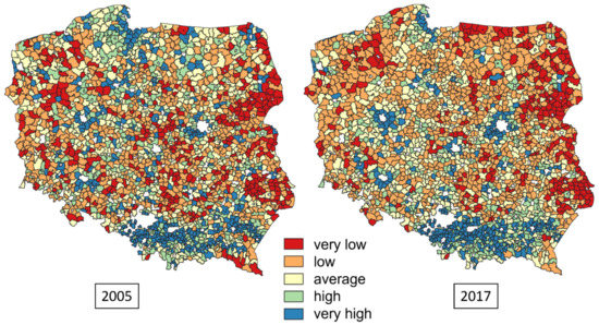 Analysing the set of one-dimensional variables used in this study to construct partial measures of development, in line with the Hellwig approach, it can be concluded that rural areas in Poland recorded an unprecedented increase in the level of socio-economic and infrastructural development in 2005–2017 (Table 2). The increase in economic activity, measured by the number of active business entities weighted by population, can be indicated as particularly significant. The average value of this indicator increased by almost 20% in the period under analysis. There was also a significant improvement in the income situation of local government units, whose own unit income doubled. It was combined with relatively favourable relations on the labour market, where an increase of the number of economically active persons was recorded (by 15%). At the same time, a certain surprise is expressed by the decreasing share of investment expenditures in the total expenditures of municipalities’ investment activities. The average value of this index decreased by almost 1/3. This is all the more important as investment activities undertaken by gminas may be regarded as one of the basic factors of local development. It should be emphasized that the level of investment expenditures of municipalities is determined by a number of factors of varied nature. These include, among others, investment needs resulting from the implementation of particular local development tasks, the amount of financial resources available to a gmina, and the adopted development strategy, as well as the macroeconomic conditions of gmina functioning, including legal conditions.