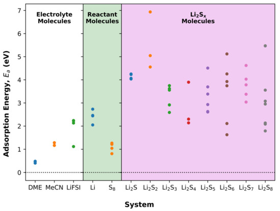 The adsorption energy, Ea (in eV) on amorphous Al2O3 ALD surface of various systems that consists of electrolyte (i.e., DME, MeCN, LiFSI in the white region), reactant (Li, S8 in light green region), and Li2Sx with 1 8 (in pink region) molecules based on DFT calculations. In general, Ea > 0 implies that the system is thermodynamically feasible. Each data point represents an individual configuration of geometry optimization in DFT calculations.
