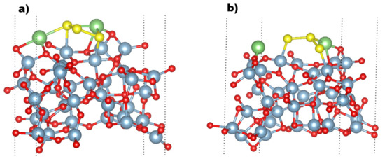 All the calculations were performed in the framework of DFT using the Vienna Ab Initio Simulation Package (VASP) version 5.4.4 [35,36]. The projector-augmented wave (PAW) method [37] and the Perdew–Burke–Ernzerhof (PBE) exchange-correlation functional [38] were used to describe the exchange-correlation effects. In this work, the Grimme’s D3 correction term [39] was applied to include the van der Waals (vdW) interaction which was found to be substantial in Li-S systems [9,13,40]. For all the calculations, the plane-wave kinetic energy cutoff was set to 500 eV. The energy convergence was set to be 10−5 eV, and all the configurations were fully relaxed until the residual force on each atom was less than 0.01 eV/Å. For all these DFT calculations, a Γ-centered K-mesh with a density of no less than 2 points per Å (i.e., KSPACING = 0.5) was used to sample the Brillouin zone during the geometry optimization. For all the simulations, the vacuum layer in the simulation cell was set to be ~15 . Based on the previous experimental results [41,42], we used an amorphous Al2O3 slab (with thickness ~8.0 ) to simulate the ALD coating layer. The amorphous Al2O3 slab configuration was used in our previous work on the lithium-oxygen battery and potassium metal battery reported recently [43,44]. For each system, generally, at least three different initial configurations were considered during the geometry optimization to locate the low-energy configuration. Throughout this work, the figures related to the optimized configurations were generated using VESTA software [45].