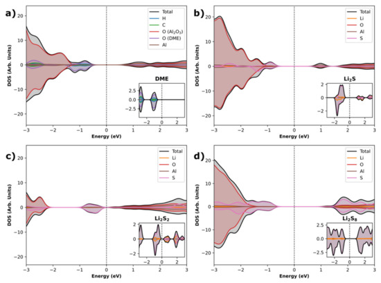 The partial electronic density of states (DOS) of the lowest energy configuration for each system during adsorption on Al2O3 ALD surface are plotted within the vicinity of Fermi level (i.e., −3.0 eV, 3.0 eV): (a) DME, (b) Li2S, (c) Li2S2 and (d) Li2S8 molecule. The dotted black line is the Fermi level. The total DOS, O-DOS, Al-DOS are in the black, red, and brown lines. The inset is the representative reference molecular system: the DME molecule DOS which O-DOS, C-DOS, H-DOS is in purple, green, and blue line (a: bottom right); the Li2S molecule DOS which Li-DOS, S-DOS is in orange and pink line (b: bottom right); the Li2S2 molecule DOS (c: bottom right) and the Li2S8 molecule DOS (d: bottom right).