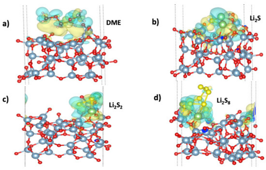 The electronic charge density difference distribution at the interface between adsorbate (a) DME, (b) Li2S, (c) Li2S2, (d) Li2S8 and Al2O3 ALD surface. The yellow is electronic charge accumulation (negative charge) region, while the blue is electronic charge depletion (positive charge) region. The isosurface values are ~0.001 e/ with the figures generated using VESTA software [45].