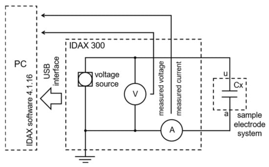 The diagram in Figure 2 contains the Tettex AG Zürich electrode system type 2903a (protective ring capacitor) with the stainless steel electrode material. It has a geometric capacity of 60 pF, a distance between the electrodes of 2 × 10−3 m, a volume of 40 × 10−3 L, and a maximum test field strength of 1 MV/m []. Testing of electrical insulating liquids was performed using an IDAX 300 measuring device [], which was connected via USB (Universal Serial Bus) to a computer with IDAX 4.1.16 software, with which the measured data were collected.
