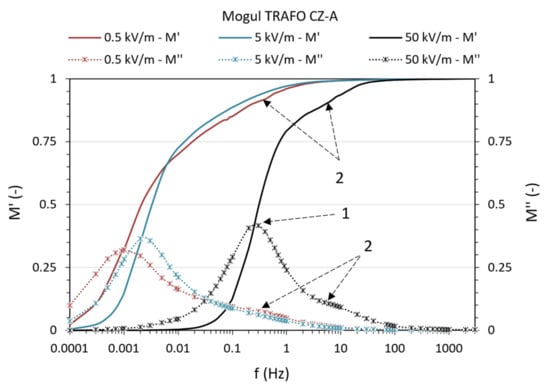 The frequency dependences of the real and imaginary parts of the complex electric modulus of SD oil are shown in Figure 5. As the intensity of the time-varying electric field increases, the curves M′ and M″ shift to higher frequencies. With said dispersion of the curves M′, there is a gradual increase in the values of Mm″ with the decimal applied intensity of the electric field. This effect indicates an improvement in the dielectric properties in approaching the ideal state with a value of 0.4865 for a given relaxation process. The number 1 in Figure 5 denotes the first polarization process, manifested by a peak (at M″) together with an S-shaped curve (at M′). The process manifested itself at frequencies of 2 mHz, 5 mHz, and 10 mHz, respectively, according to a decimal increase in electric field strength. In the high-frequency band of the measured frequency spectrum, from approximately 400 Hz, the values of M′ and M″ gradually increase. The given increase in values is attributed to the developing polarization phenomenon, marked with the number 2. Its relaxation maximum cannot be defined due to the limited frequency range of the measuring instrument.