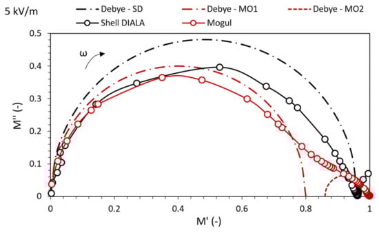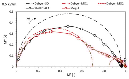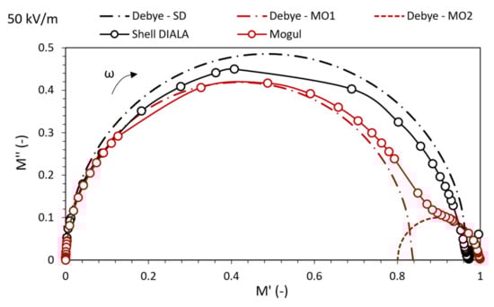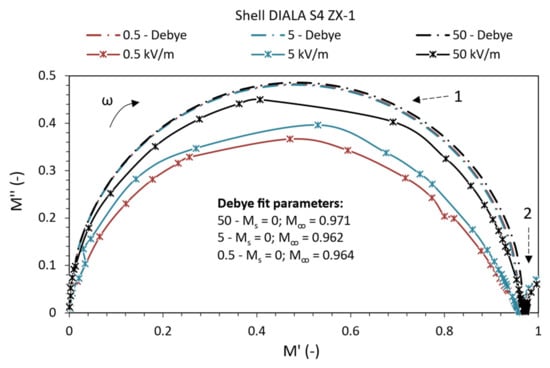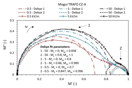 Confirmation of the ongoing events in the SD oil of Figure 5 is presented by plotting it in the Cole-Cole diagram in Figure 6. In this view, we point to the presence of one polarization process with a capture of the beginning of the developing second polarization process. According to the Cole-Cole principle, ideal Debye curves were obtained for different electric field intensities, the output parameters of which differ only slightly. The obtained parameters α, given in Table 3, indicate a more significant distribution of relaxation times with a decimal decrease of the applied intensity of the time-varying electric field. It is due to the increasing displacement of the center of the semicircle below the real axis M′. In the developing second polarization process in the frequency band, it was not possible to determine the ideal characteristics of Debye, as this is only an indication of said relaxation.