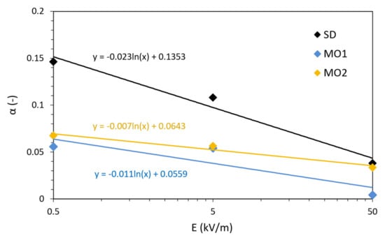 Figure 10 shows the regression lines of the relaxation time distribution parameter α depending on the applied intensity of the time-varying electric field. With a decimal increase in the intensity of the electric field, α decreases in all captured relaxation processes. By comparing oils, MO mineral oil has a lower relaxation time distribution than SD oil, similar to that described in Section 5.3.