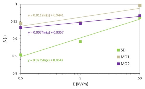 The parameter β in Figure 11 shows an increasing trend of approaching the ideal Debye characteristics with a decimal increase in the applied intensity of the time-varying electric field. Publication [] contains the dielectric behavior of a weakly polar ferrofluid based on mineral oil MO. Relaxation process very close to Debye’s behavior was captured at an intensity of 20 kV/m and an oil temperature of 358 K. From our measurements we found that MO mineral oil shows Debye behavior (β = 0.996 and β = 0.967) even without additional nanoparticles of Fe3O4 magnetite, at the different intensity of time-varying electric field (50 kV/m), at a different oil temperature (294 K) and lower frequency spectrum (0.1 mHz–3 kHz).