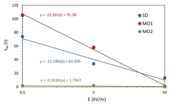 Regression lines of relaxation time τM depending on the intensity E of the time-varying electric field.