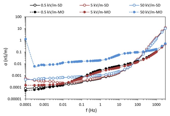 Electrical conductivity is also an important parameter for characterizing the state of a dielectric material. For a complete description of the investigated electrical insulating oils with an impact for use in practice, we must also consider the conductivity processes in the material when applying the intensity of the electric field. Figure 13 shows the frequency dependence of the electrical conductivity σ of the investigated oils at the intensity of the time-varying electric field. The electrical conductivity of the researched oils increases with increasing frequency, which corresponds to the theoretical assumptions. Said increase in the electrical conductivity of the hydrocarbon oil SD is steeper than the increase in the electrical conductivity of the mineral oil MO, especially in the high-frequency range. The influence of the intensity of the time-varying electric field is directly proportional to the increase of the electrical conductivity of the investigated oils, especially in the low-frequency band. This dispersion is present in the entire frequency spectrum at an applied electric field strength of 50 kV/m for MO mineral oil. Through the frequency-dependent electrical conductivity characteristics of oils at main frequencies of 50 Hz and 60 Hz, the dielectric response indicates a higher conductivity of MO mineral oil, caused by less charge absorption and greater distribution of free charges in the liquid. It applies to all applied intensities of the time-varying electric field. The condition of the hydrocarbon oil SD is better in this respect, which would improve the operation of the AC (Alternating Current) power equipment.