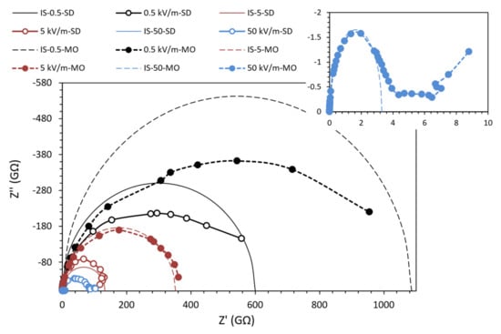 To test the electrical insulating character of MO and SD oils, we present graphs of complex impedance Cole-Cole in Figure 14. As the intensity of the time-varying electric field increases, the impedance in the complex plane decreases. It means that it is not possible to display all impedance characteristics in detail. An increase in impedance with a decrease in field strength causes a detailed capture of the low-frequency range of Cole-Cole characteristics. These impedances in the complex plane correspond to the low-frequency spectrum in Figure 13, where it increases that as the impedance of the material increases, the electrical conductivity decreases. In addition to the Cole-Cole impedance curves, ideal semicircles (IS) were plotted for all applied electric field intensities of both investigated oils. According to [], the conductivity of a material is described by impedance in the complex plane, where it is stated that the ideal Cole-Cole formalism represents pure unidirectional conductivity. Comparing the Cole-Cole complex impedance curves with the plotted ideal semicircles in Figure 14, it is clear that the distribution of free charges in the investigated fluids under a time-varying electric field is not purely unidirectional. Therefore, we attribute this dispersion to the superimposed conductivity of direct current and alternating current. This statement is also supported by the Cole-Cole impedance study in [].