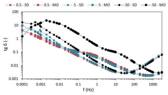 Electrical insulating oils show dielectric losses under high voltage stress. Knowledge of dielectric losses is very important from the point of view of the design and operation of the equipment to prevent failure due to dielectric thermal effects. Measuring dielectric losses at regular intervals is the only diagnostic tool to determine the degree of degradation of the insulating fluid in the aging process. Dielectric losses are described by the dissipation factor tg δ as a measure of the power loss in a liquid when a time-varying electric field is applied. The generated energy is converted into heat and heats the liquid, which requires additional energy for faster heat dissipation. For this reason, monitoring and optimizing the dissipation factor is very important to maintain sufficient efficiency of electricity transmission with the lowest possible operating costs [,]. Figure 15 shows the dependence of dielectric losses in the frequency band.
