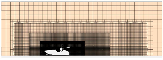 After the surface mesh was divided, the volume mesh was divided. The type of volume mesh is cut volume mesh, which ensures the accuracy of simulation calculation and coordinates the feasibility of simulation scheme. Encryption domains of different sizes were set. The following encryption strategy was adopted: a total of three layered body-grid encryption domains were set up to encrypt the model and computing domain layer by layer, as shown in Figure 3.