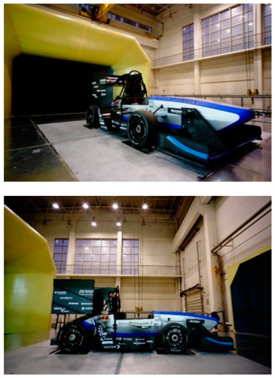 This test was carried out in the Automotive Wind Tunnel Laboratory of Jilin University. The FSAE racing car was placed in the open test section, and the overall layout scheme of four-wheel support was adopted [21,22]. The racing car model is shown in Figure 5.