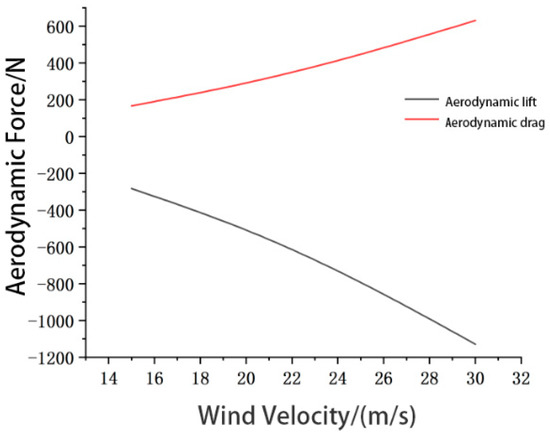 Lifting drag characteristic curve at 15–30 m/s wind velocity in straight-line condition.