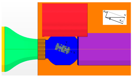 Then the crosswind angle of side-wind dynamic characteristics was tested from −15° to +15°. The yaw model method by changing the attitude of the car body to achieve the crosswind encountered in the driving process was adopted in the test, and the crosswind angle of the test model changed by 5° each time. The diagram of the yaw model method in the wind tunnel test is shown in Figure 7. During the driving process of the car, the angle β between the incoming flow direction and the car body is the crosswind angle of car, and it is also the yaw angle in yaw action. The angle β is divided into positive and negative angles, which defines the clockwise yaw of car in the top view, and the angle β is the positive crosswind angle. Now, by the yaw model method, in the car body coordinates for reference, the vector triangle method is adopted to decompose to flow velocity, v, according to the relative motion, along the X direction of the car body velocity component—vA equivalent to the car speed, vW along the Y direction of the speed car body components can be equivalent to crosswind velocity and the velocity of two equivalent velocities is the product of incoming velocity v and β angle trig function. The formula is expressed as follows: