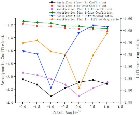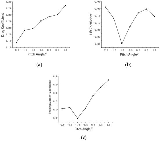 When analyzing the pitch condition of the car, the range of pitch angle of the car was determined to be from −2.0° to 1.0°, the simulation wind velocity was set to 15 m/s and the increment of body pitch angle was 0.5°. A total of 14 conditions were simulated and analyzed. Figure 8 shows the trend of lift coefficient, drag coefficient and pitching moment variation curves in various working conditions.