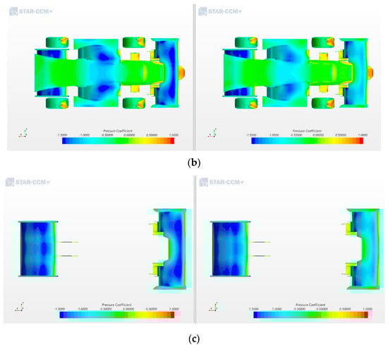 Comparison of pressure cloud images of racing cars in pitching condition of −1.0° (left) and 0.5° (right): (a) the main view of the vehicle, (b) the vehicle and (c) the front wing and the side wing.