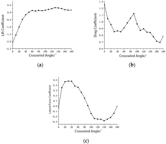 Variation curves of lift coefficient, drag coefficient and lateral force coefficient at 0°~180° crosswind angle: (a) lift coefficient, (b) drag coefficient and (c) lateral force coefficient.