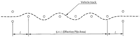 According to the test requirements of snaking test in GB/T 6233-2014 [23], the road modeling section is modeled according to the pile arrangement diagram. The ground friction system is 1.0, and the pile arrangement diagram is shown in Figure 11.
