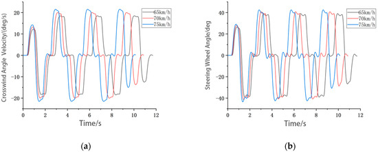 The simulation was evaluated according to the serpentine test evaluation method in the automobile handling and stability index limitation and evaluation method of QC/T 480–1999 automobile industry index of the People’s Republic of China [24]. The test was evaluated and scored according to the average crosswind offset velocity peak value, r, and the average steering-wheel-angle peak value, θ, at the reference speed.