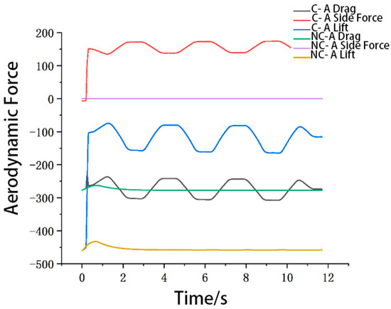 The aerodynamic parameters of the numerical simulation and wind-tunnel test under the condition that the wind velocity is 15 m/s, the crosswind angle is 0° and the body attitude is unchanged are shown in Table 2. The simulation data of the yaw model method and the aerodynamic characteristics data of the yaw model method in the wind tunnel test are shown in Table 3 for when the synthetic wind is 15 m/s and the crosswind angle is 10°.