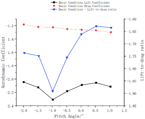 Through Figure 19, with the decrease of pitch angle, the aerodynamic drag increases gradually, and the aerodynamic downforce coefficient increases first and then decreases. The lift–drag ratio curve reaches the extreme value of −1.888 when the pitch angle is −1.0°. The lift–drag ratio is defined as the ratio of lift coefficient to drag coefficient, and its calculation formula is shown in Equation (6):