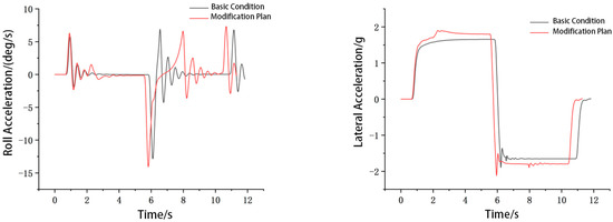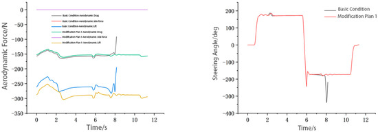 Figure 27 and Figure 28 show the comparison curves of aerodynamic force, steering-wheel angle, roll angle velocity and lateral acceleration before and after aerodynamic parameters under different pitch modification conditions. As can be seen from Figure 27, when the driving speed of the car is reduced by 1 km/h, the aerodynamic downforce in base condition is far less than that of the adjusted car, and the maximum difference of downforce is 29.05% of the pressure in base condition. As the wind speed decreases, the drag of the car in base condition is slightly less than that of the adjusted car. The aerodynamic force of the car fluctuates significantly in 0–2.0 s and 6.0–8.0 s. The aerodynamic force fluctuation of the car in 0–2.0 s is caused by the unstable speed control of the car in the initial stage. It can be seen from the steering-wheel-angle curve that the steering-wheel angle of the car around 6.0 s is close to 400° in a short time, and the car enters the right circle from the left circle; the aerodynamic force fluctuates slightly, due to the change of body attitude. According to the analysis of the roll-angle-velocity curve in Figure 28, the car body’s roll angle fluctuates significantly in the three stages of the car that include turning into the left lap, entering the right lap from the left lap and turning back out of the right lap. The adjusted car’s transient response is relatively rapid. The roll-angle-speed curve shows that the car tires with the ground appeared near 8.0 s brief separation after the modification. Since the longitudinal velocity is greater than that in base condition, when the car starts to turn, the lateral acceleration of the car after adjusting the aerodynamic parameters in pitch condition is greater than that in base condition.