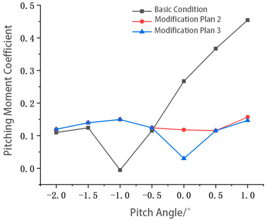 It can be seen from Figure 24 that two pitching moment coefficient adjustment plans with different understeering characteristics are proposed based on base conditions, and the understeering characteristics of Modification Plan 2 are slightly greater than that of Modification Plan 3. The coefficient fluctuation of the two plans is less than that of the base condition. The basic body attitude of the car is the best attitude of the aerodynamic characteristics of the car. The coefficient fluctuation of different pitching angles is small, the comprehensive adaptability of the car is stronger and the sensitivity is lower.