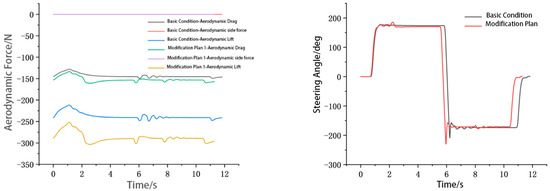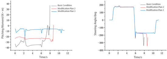 The influence of the adjusted aerodynamic torque parameters on the handling stability of the car was verified. In this simulation, the longitudinal speed of the car with different modification plans is the same, which is 49 km/h, and the speed increases by 0.1 km/h. Figure 25 shows the comparison curve between the pitching moment of the car adjusted by the pitching moment coefficient and the steering-wheel angle.