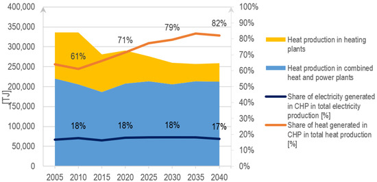 Forecast of heat production [TJ] and share of electricity and heat produced in cogeneration [%]. Source: PEP2040 [16].
