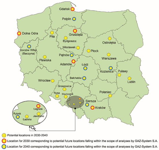 The cogeneration investment planning phase is a major challenge for the preparation of CHP investments in Poland—primarily in the technical, economic, financial and environmental areas. The lack of proper identification of project risks causes delays, increases costs and worsens the investor’s economic performance. Due to inadequate risk identification at the phase of project definition and planning, wrong technical assumptions are made, which interfere with the proper project implementation or reduce their profitability. Figure 2 shows potential locations for new natural gas-fired generating units in the period up to 2040.