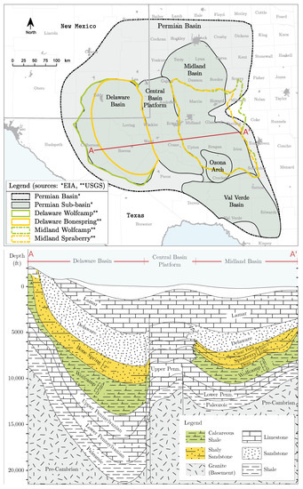 Figure 1 shows the areal extent of Permian Basin that spans an area of 75,000 square miles at the border between Texas and New Mexico. According to EIA [21], Permian Basin is further divided into several sub-basins: (1) the Central Basin Platform, that is the shallowest sub-basin, where the oldest vertical wells have been drilled since the 1930s; (2) the Midland Basin, which contains the tight Spraberry formation and Wolfcamp shale; (3) the Delaware Basin, which is the deepest sub-basin that contains the tight Bonespring formation and Wolfcamp shale; and (4) the Val Verde Basin, which produces an insignificant amount of oil and gas compared to the other three sub-basins. From USGS [6], we obtained the maximum extents of the major tight formations of the Permian age (290–275 million years ago): the Spraberry, Bonespring, and Wolfcamp in both Delaware and Midland Basins. In Figure 1, we also show a west-to-east vertical cut of the Permian Basin, cross-section (A-A). We see that Spraberry in the Midland Basin is a shaly sandstone formation, relatively shallower compared with other major tight rocks. It consists of two main layers: the Upper and Lower Spraberry. Bonespring in the Delaware Basin is also a shaly sandstone formation, deeper than Spraberry. It consists of three main layers: the 1st, 2nd, and 3rd Bonespring. Lastly, Wolfcamp is a calcareous shale formation that exists in both Midland and Delaware basins. It is deeper and thicker than other major producing formations, and consists of four layers: Wolfcamp A, B, C, and D.