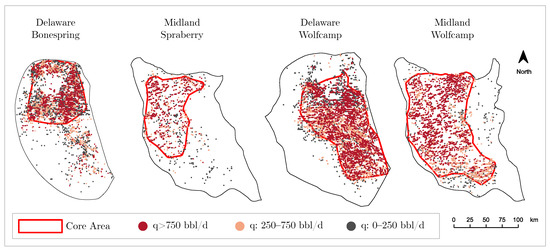In Figure 2, we plot the maximum daily oil rates from the four major sub-regions of the Permian: (1) Delaware Bonespring; (2) Midland Spraberry; (3) Delaware Wolfcamp; and (4) Midland Wolfcamp. A Core area is an area that envelopes all best producing wells with the maximum daily oil rates of more than 750 bbl/d. We define each Noncore area as the difference between the core area and the formation extent defined by USGS.