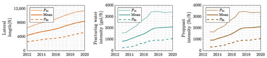 From Figure 1 and Figure 2, we infer that well productivity varies across different sub-basins, and with reservoir layer depths. In addition, production in the Permian also varies with completion date intervals. We found that the newly completed wells produce at higher initial oil rates, but they decline faster. The production improvements among the new wells result from the advancements of completion technology in the Permian Basin. We observed similar trends in the Bakken [9], Haynesville [10], and Marcellus [11]. In Figure 3, we plot the mean, upper bound () and lower bound () of lateral lengths, fracturing water intensity, and proppant intensity. Over the last eight years, operators have drilled horizontal wells that are twice longer, and have doubled the amounts of hydraulic fracturing water and proppant per lateral foot.