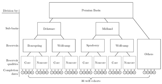 Finally, we come up with a well classification shown in Figure 4 that divides all 53,708 horizontal wells into 36 well cohorts based on nine reservoir qualities and four completion date intervals. The first eight reservoir qualities are a combination of sub-basin, reservoir, and core-noncore divisions. All horizontal hydrofractured wells that do not fall into one of these categories are classified as the ninth reservoir quality: ‘Others’. The four completion date intervals are: (i) 2008–2013; (ii) 2014–2015; (iii) 2016–2017; and (iv) 2018–2021.