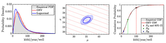 For each spatiotemporal well cohort in Figure 4, we first construct a historical well prototype using the Generalized Extreme Value (GEV) statistics. GEV is a generalization of the three extreme value distributions: Fréchet [12], Weibull [14], and Gumbel [13]. There are three parameters for a GEV distribution: the location parameter (), the spread parameter (), and the shape parameter (). The value of determines which of the three extreme distributions results, Fréchet (), Weibull (), and Gumbel (). Using Equations (A1)–(A3), we calculate the probability density function (PDF), the cumulative distribution function (CDF), and the expected value or mean of the annual oil production of each well cohort for each -year on production. Figure 5 is an example of matching the annual production from 1269 horizontal hydrofractured wells with at least 1 year on production. These wells are completed in the Delaware Bonespring during 2008–2013. The shape factor is 0.1412, which yields a Fréchet distribution, typical of many other shale plays. The values of and are shown as a contour plot of the 95% confidence interval (CI). From the cumulative density function (CDF) plot, we obtain , , and . We overlay both GEV and lognormal fits on the empirical PDF to show the superiority of the GEV distribution in matching annual production in the Permian.
