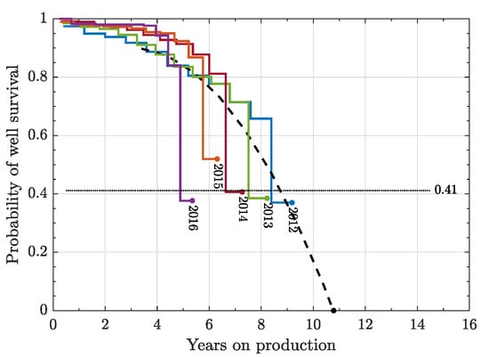 The well prototypes obtained from GEV statistics and physical scaling are highly idealized, and assume that de facto production from each well continues uninterrupted for several decades. The increase in water production, the reduction of reservoir pressure, the reduction of effective rock permeability, and well integrity problems are some of the reasons why operators shut-in their wells after less than 15 years on production. Therefore, we ought to calculate the maximum time on survival, , that limits the durability of all wells represented by their prototypes. Figure 8 is an example from the Delaware Bonespring Core that shows why years from the data based well survival probabilities. We calculate the probability of well survival from Equation (A7). Finally, Table 3 summarizes the values of for all Permian sub-regions. Typically, the core area wells survive longer than the noncore area wells, as also observed for other shale plays.