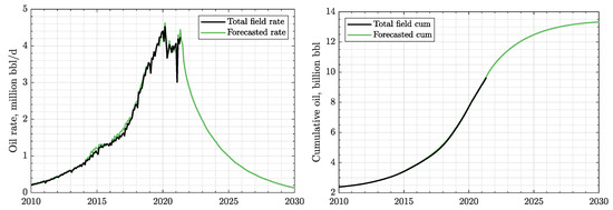 Next, as the obtained historical well prototypes are limited by the longest record of well data, we use our physical scaling (Physical scaling is a robust physics-based method of forecasting oil and/or gas production from the hydrofractured shale/tight formations. This method was first introduced in [15,16] for the Barnett shale, where it was shown that cumulative production from thousands of horizontal gas wells could be collapsed to an almost universal master curve. See Appendix B to learn more about physical scaling) that extrapolates the prototypes for several more decades. In Figure 6, we show the extrapolated well prototypes using physical scaling as the thick green lines. The corresponding fitting parameter, , and the average-cohort estimated ultimate recovery (EUR) are tabulated in Table 1 for the 36 Permian well cohorts. We observe that both the Delaware Bonespring Core and the Delaware Wolfcamp Core give the highest EURs. This is because these two formations are thicker and more mature than those in the Midland Basin. On the other hand, the newer wells yield significantly higher EURs due to longer lateral lengths and bigger hydraulic fractures. However, in areas of poor reservoir quality, these advancements of completion technologies cannot help much.