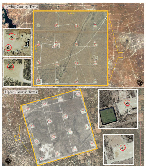 Snapshots from Google Earth in Loving County, Texas (Delaware Basin) and Upton County, Texas (Midland Basin). The densest area contains about 16 wells per square mile.