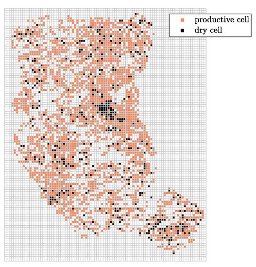 To obtain a more realistic number of future producing wells, we multiply the infill potential with the probability of success, that is defined as a probability of successfully finding the non-dry (productive) wells. As an example, we show the spread of dry (black) and productive (orange) cells in the Midland Wolfcamp Core in Figure 13. The values of for all Permian sub-regions is summarized in Table 3. We observe that is about 0.8 for all major core and noncore Permian tight formations, except for the ‘Others’ region where the reported is as low as 0.33.
